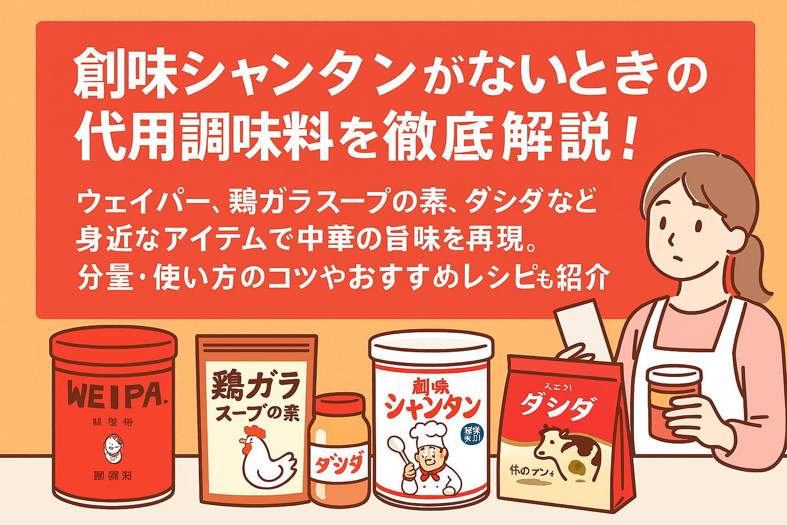 創味シャンタンの味を再現するためには、旨味とコク、塩気、香りのバランスが重要です。以下の調味料が代用としておすすめです。