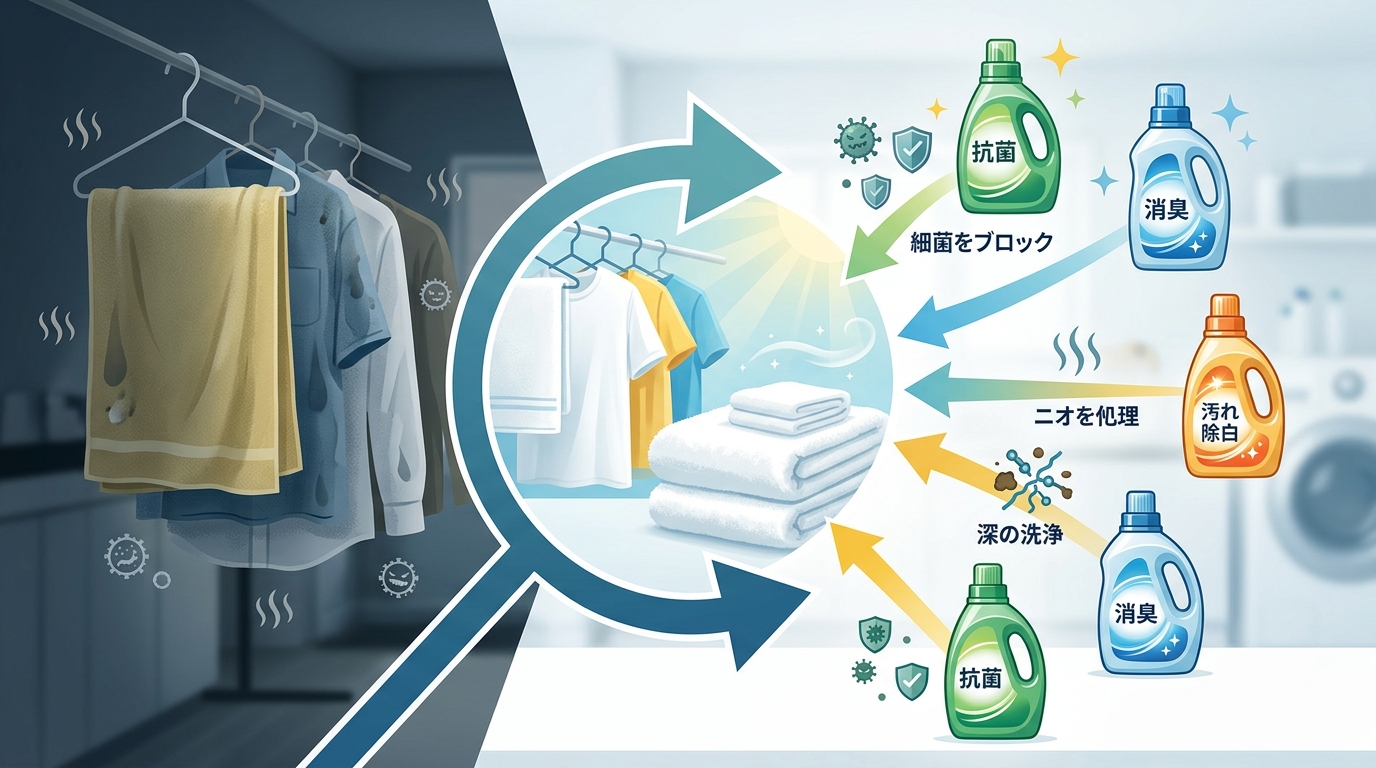 この記事では、そんなあなたの悩みを解決するため、部屋干し洗剤の「違い」を徹底的に比較解説します。それぞれの洗剤がどんなメカニズムで生乾き臭にアプローチするのか、そしてあなたの生乾き臭問題に本当に効くのはどんな洗剤なのかを、具体的にご紹介していきましょう。
