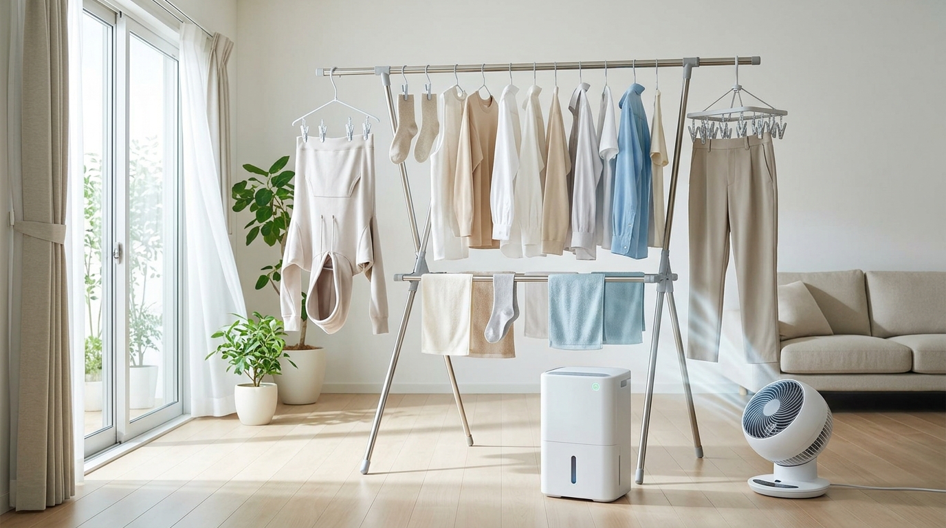 • 除湿器:部屋の湿気を取り除いてくれるため、部屋干しの強力な味方です。洗濯物の真下に置くと効果的です。